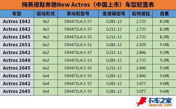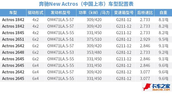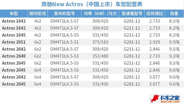 在燃油公告中出现的这十款奔驰New Actros,后桥速比大的是6x4车型,有3.07和2.846两种速比;小后桥速比车型为三款4x2车型,都是为2.733速比;剩下的四款6x2车型的后桥速比有2.929、2.846、2.733三种可选。