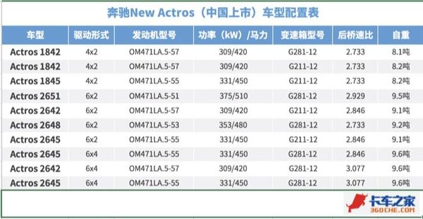 昨天的发布会上,奔驰并没有发布具体车型和价格,但是通过查询交通部燃油公告,我们能够清楚地看到奔驰New Actros在中国上市的具体车型。在中国,营运车辆必须申报燃油公告才能上营运手续并合法经营,搭载奔驰OM471发动机的New Actros在燃油公告上将会有十款车型。